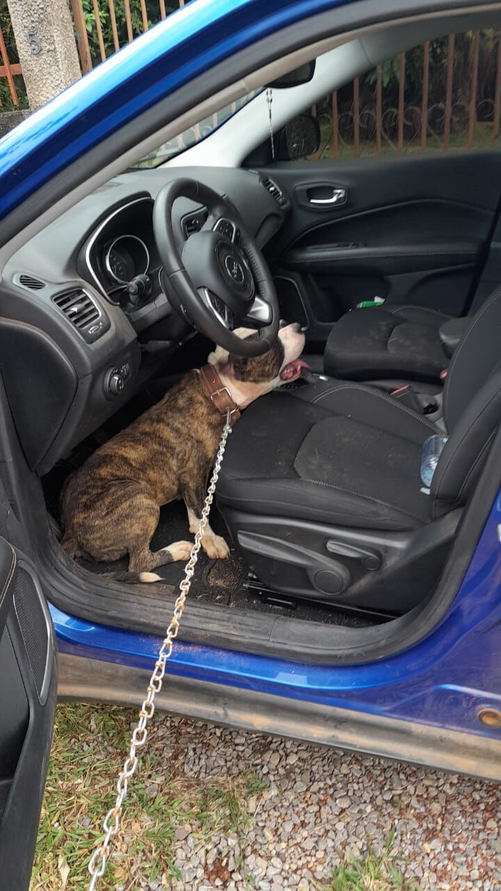 Parei o carro e ele na hora pulou pra dentro pra fugir da chuva. Ele está de coleira e parece castrado, e estava até com uma corrente novinha presa na coleira. Eu tirei a corrente pra não prender em algum carro e ele se machucar.